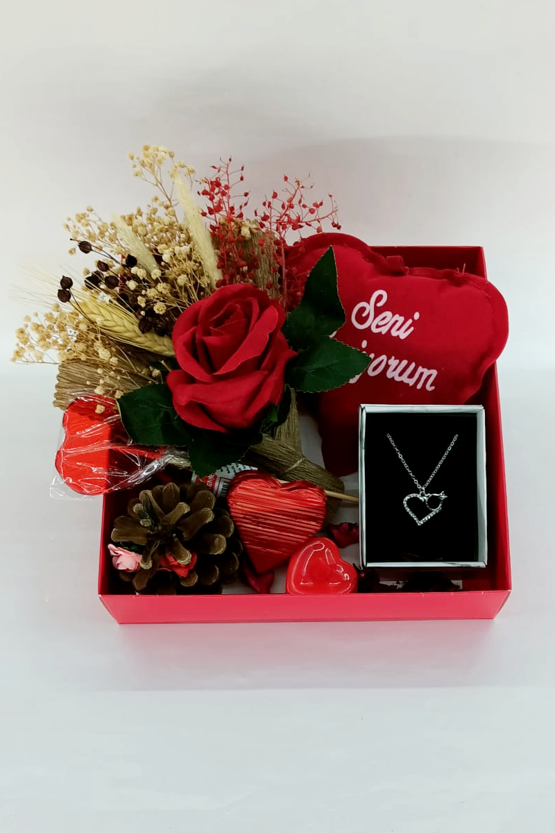 Kutuların içinde yer alan ayçiçeği desenli aynalar, şık kolyeler ve özel aksesuarlar, hediyenize zarafet katar.