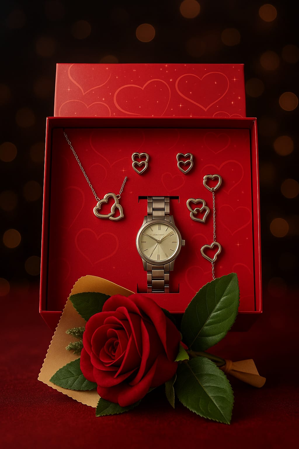 Sevgilinize romantik anlar için şık bir saat ve takı seti hediye edin. Zarif tasarımı sayesinde her kombine uyum sağlar. Günlük ya da özel günlerde dikkat çeken bir seçenektir.